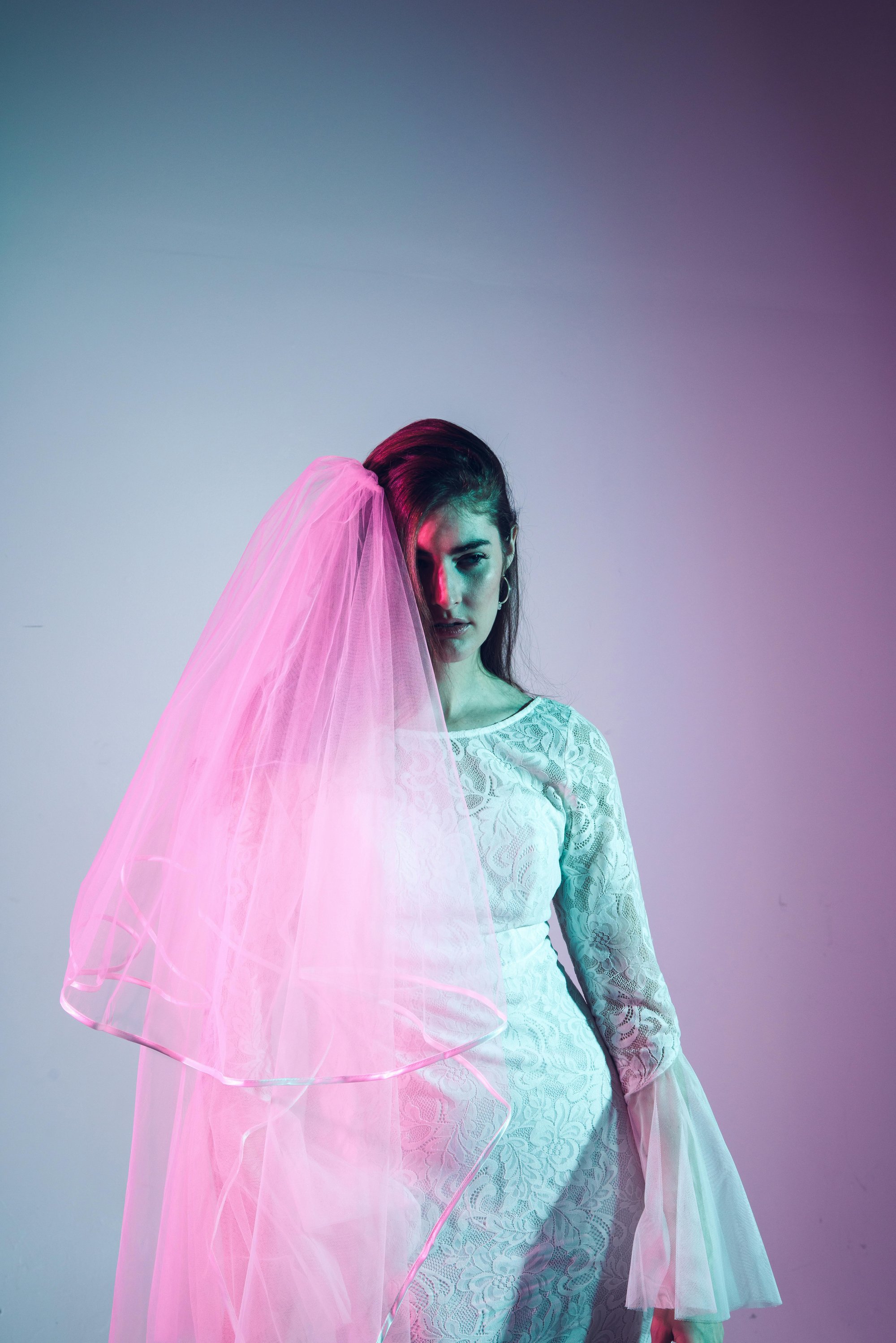 - Fabric: Layers of sheer chiffon with fine lace overlay